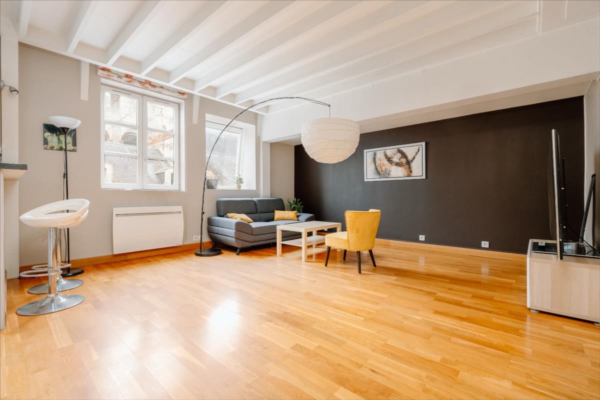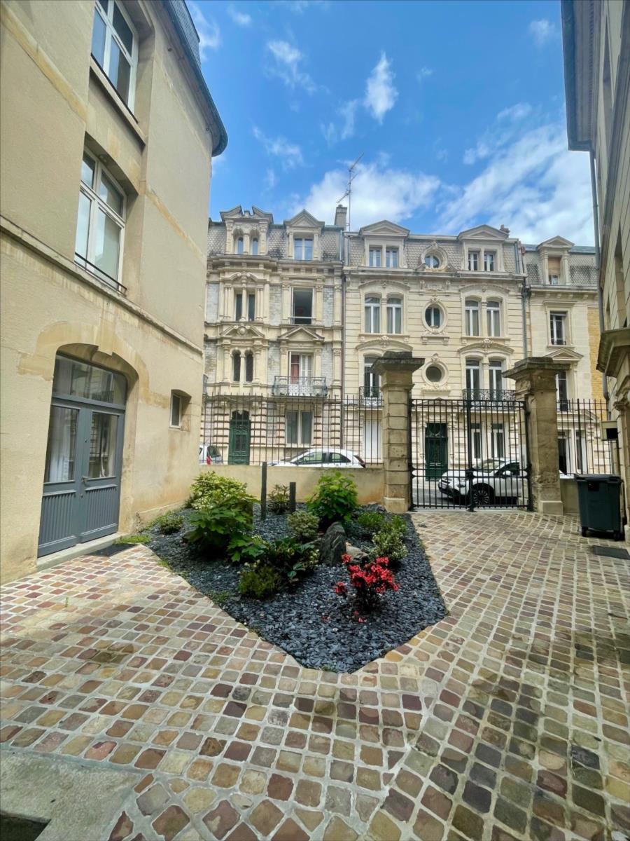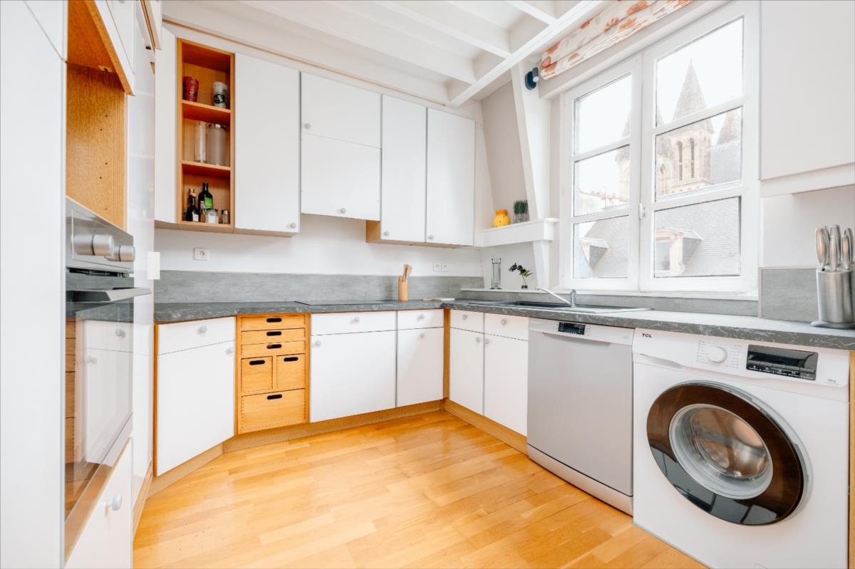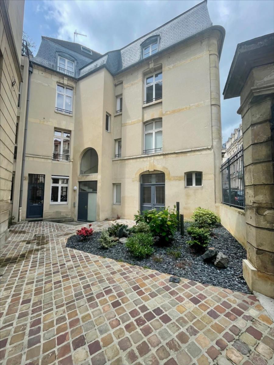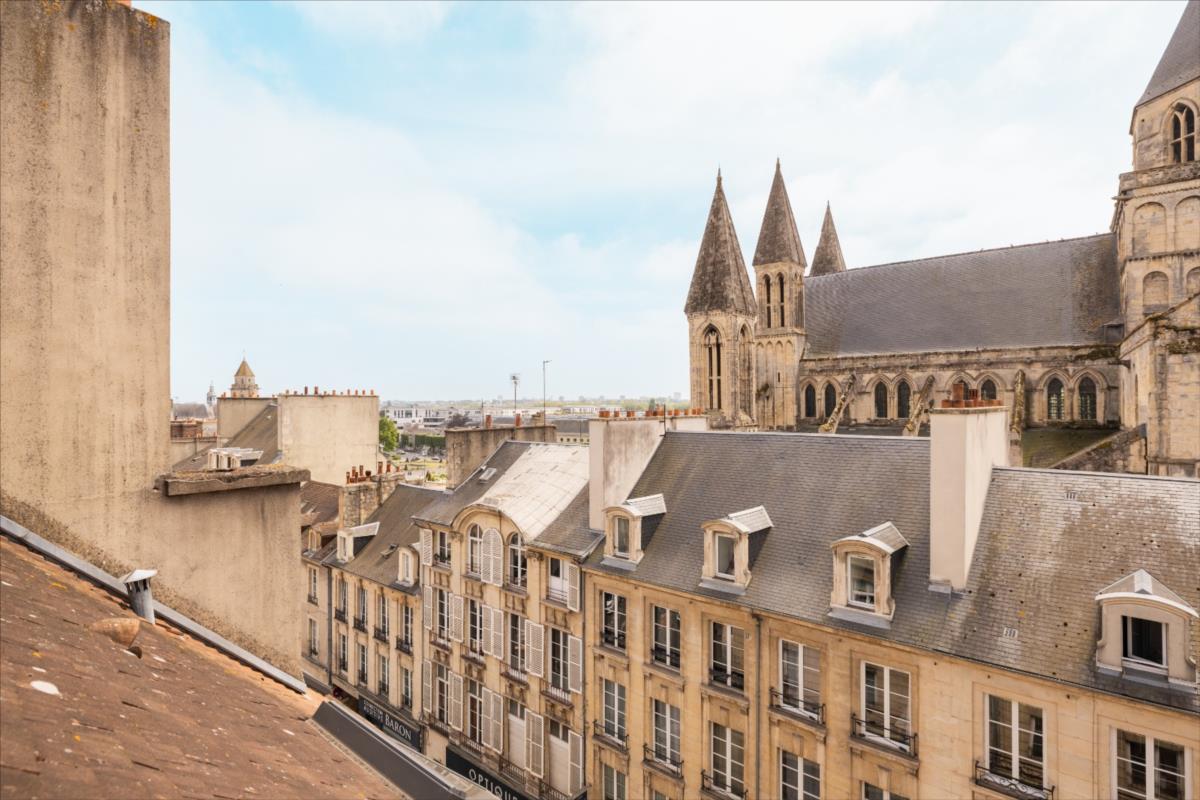 Hyper centre ville de Caen, dans une copropriété du XIXème siècle avec ascenseur, un appartement de standing en triplex comprenant une entrée avec placard, cuisine aménagée récente, séjour-salon orienté sud.