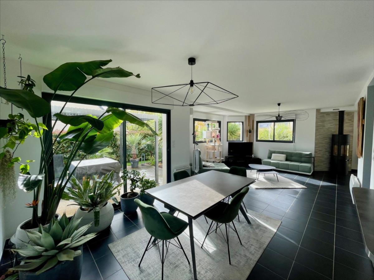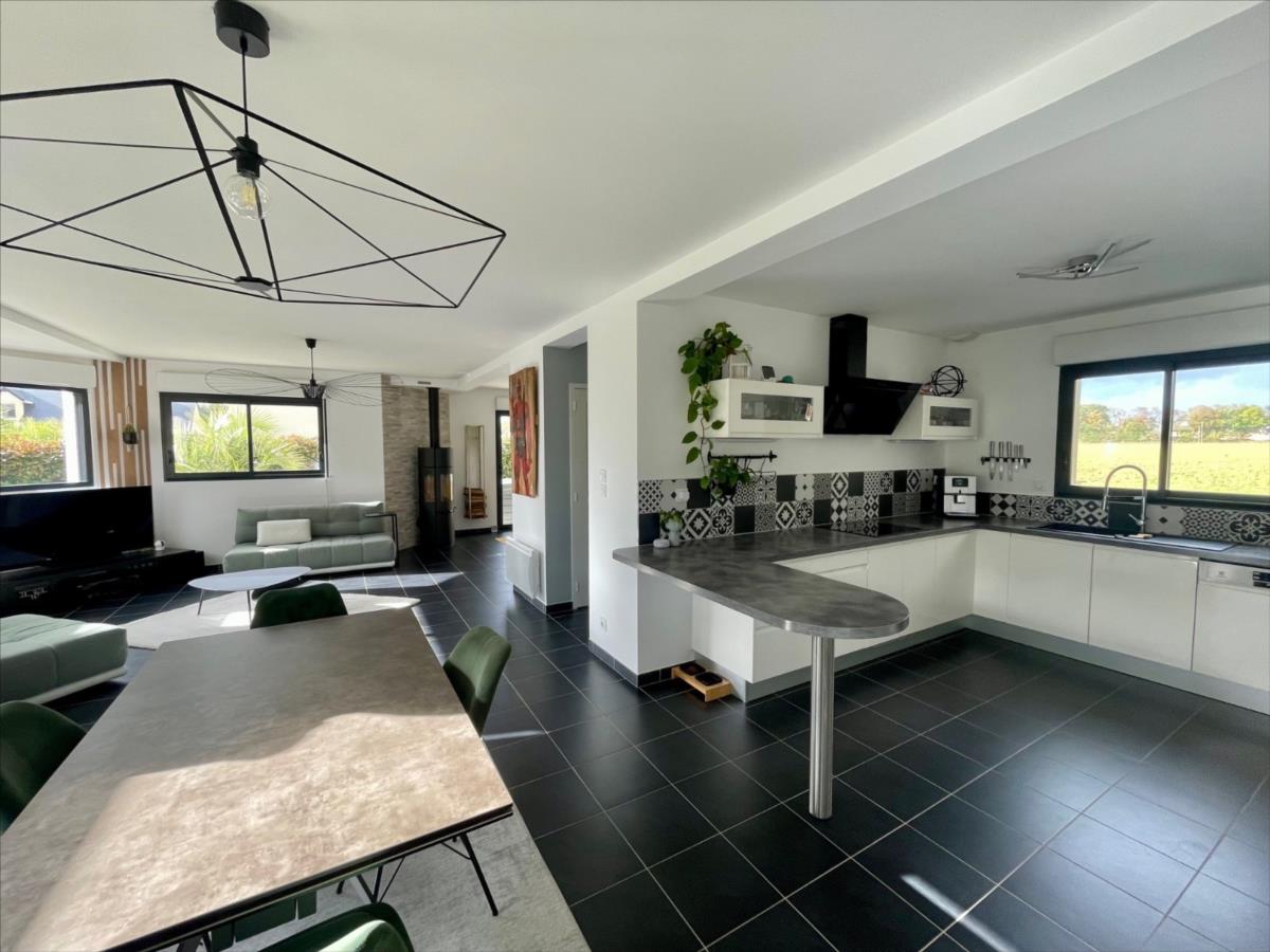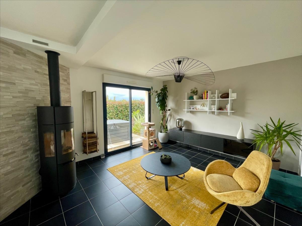 Dans une commune avec bus de ville, en impasse, maison très lumineuse, d'une surface de 107 m2 composée d'une entrée, placard, wc, cuisine aménagée et équipée ouverte sur un séjour-salon de 46 m2 avec un poêle à bois et orienté sud.