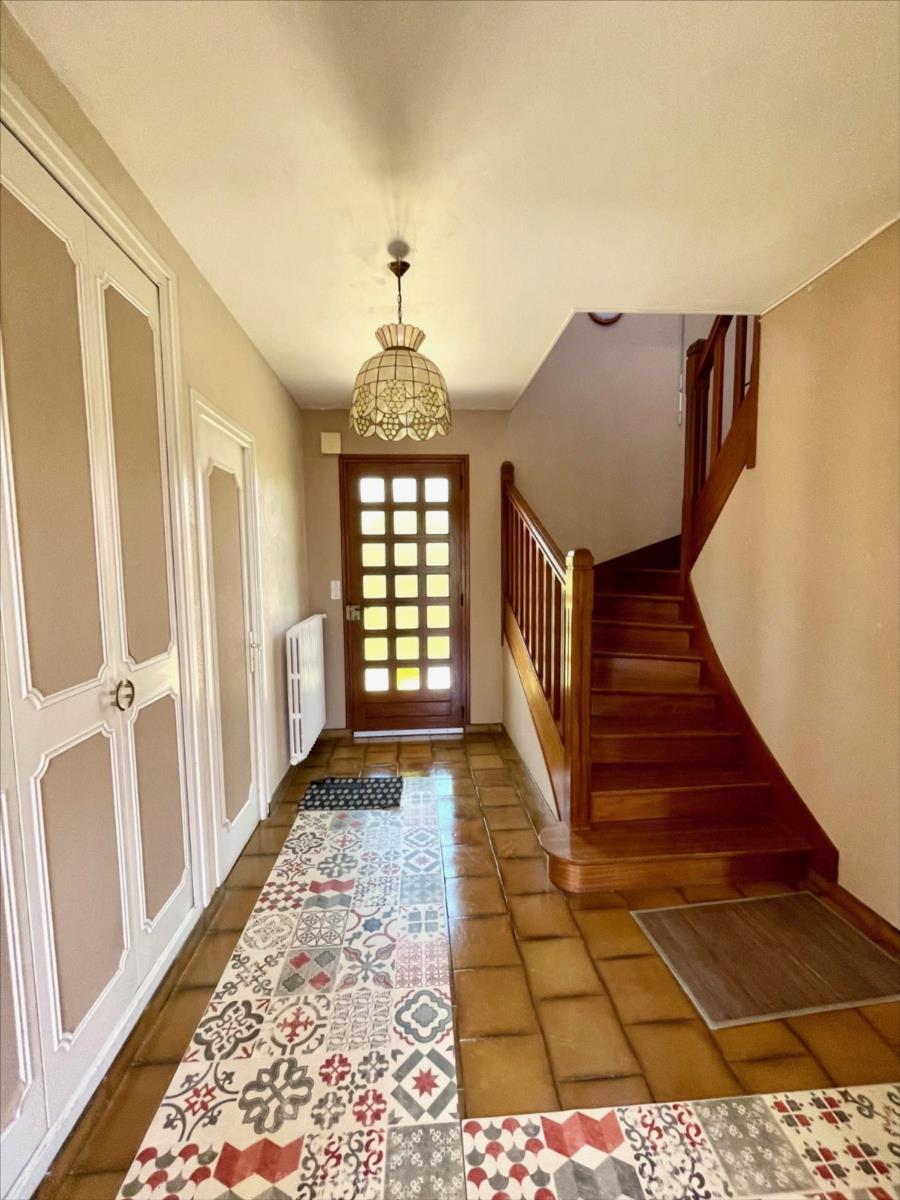 Dans un quartier au calme, maison lumineuse d'environ 150 m2 sur sous-sol complet et composée d'un hall d'entrée avec placards, wc, cuisine aménagée, vaste salon-séjour avec cheminée et orienté sud-est, une chambre avec salle de douche.